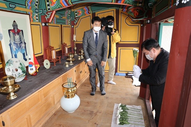 | ▲ 싱 하이밍 주한 중국대사가 정유재란(1597년 8월 ~ 1598년 12월) 당시 수군 도독으로 이순신 장군과 함께 왜군을 물리친 명나라 진린 장군의 위패가 모셔진 해남군 산이면 황조리 황조별묘를 찾아 참배를 하고 있다. 명나라 멸망 후 진린의 후손들이 해남에 정착하면서 황조별묘는 한국과 중국의 오랜 인연과 우정을 상징하는 대표적인 장소로 부각되고 있다. / 해남군 제공 |