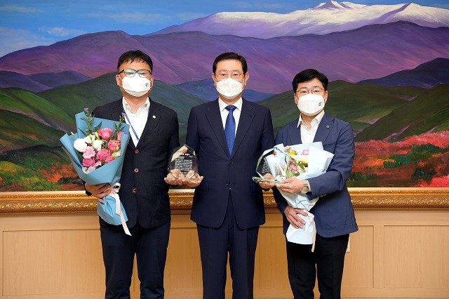 | ▲ 이용섭 광주광역시장이 2일 오전 시청 대회의실에서 열린 6월중 정례조회에 참석해 이달의 공무원에게 시상한 후 기념촬영을 하고 있다. / 좌측부터 에너지산업과 에너지관리팀 이재철 주무관, 이용섭 광주광역시장, 봉현수 주무관 / 광주광역시 제공 |