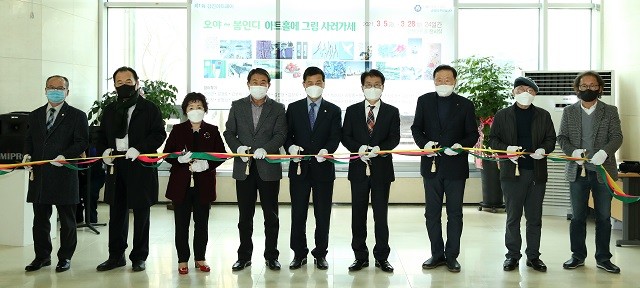 | ▲ 이승옥 강진군수(좌측부터 6번째),제1회 강진아트페어 직거래 미술 시장 개막식 테이프 절단식 퍼포먼스 / 사진=강진군 제공 |