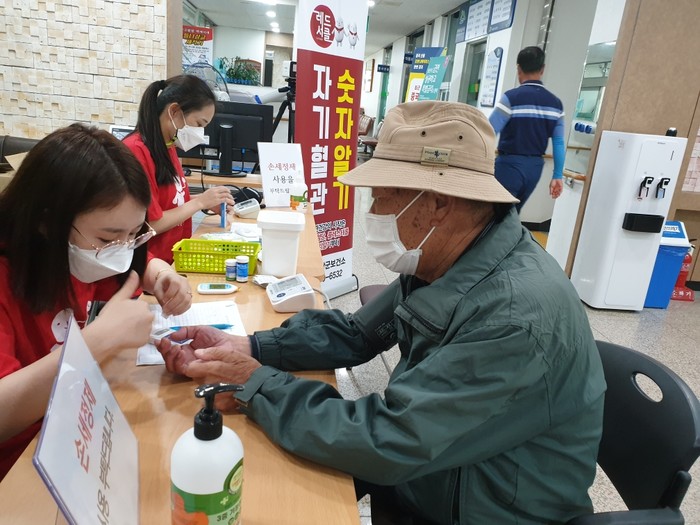 | ▲ 영암군 보건소 관계자가 민원인으로부터 혈액체취를 하고 있다. / 영암군 제공 |
