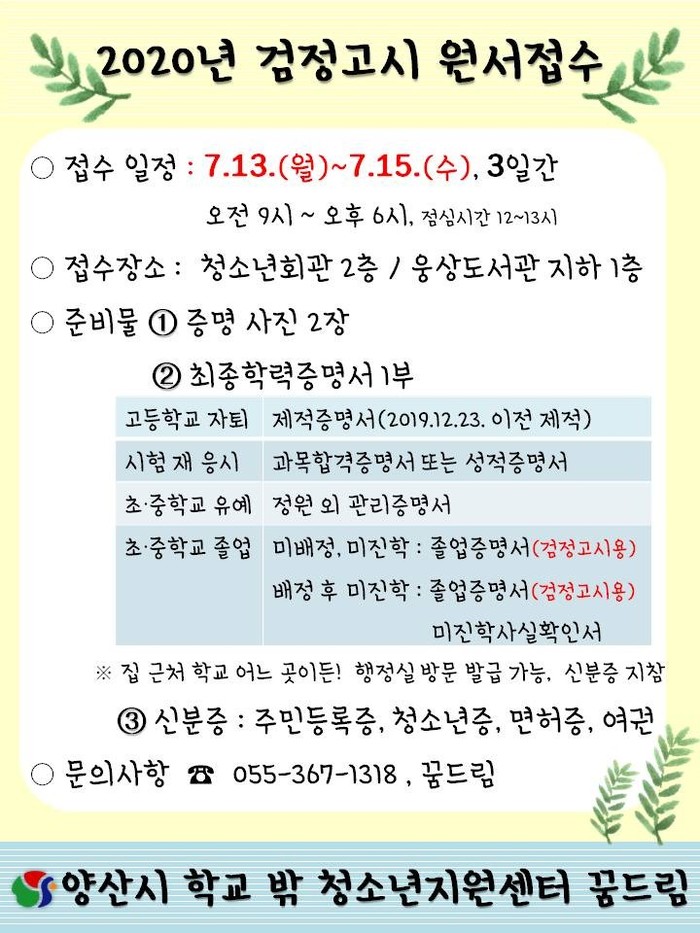 양산시 학교 밖 청소년지원센터 꿈드림(이하 양산시 꿈드림)에서 학교 밖 청소년들의 2020년 제2회 검정고시 응시를 위해 단체 원서접수 지원서비스를 진행한다.