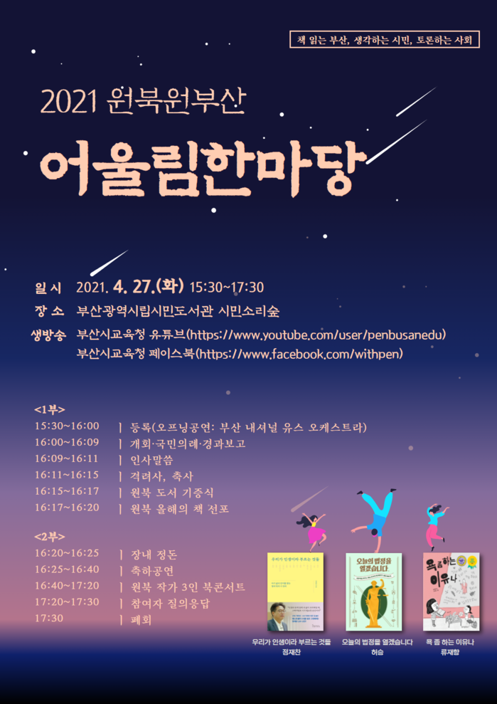 김흥백 시민도서관장은 “코로나로 인해 어울림한마당에 참석하지 못하는 시민들은 온라인을 통해 참여할 수 있다”며“원북원부산이 더욱 빛날 수 있도록 시민들의 많은 참여를 당부드린다”고 말했다.