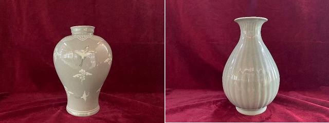 | ▲ 좌측) 청자상감운학문호 (우측)청자양각죽적문화병(사진제공=강진군청) |