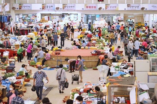 [강진=정찬남 기자] 제14호 태풍 ‘찬투’의 영향으로 흐린 날씨를 보인 14일 전남 강진군 강진읍 5일 시장이 추석 제수용품을 마련하려는 주민들로 북적이고 있다.