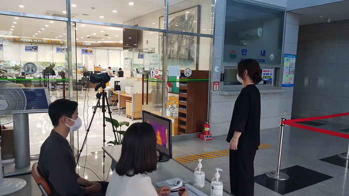 청사 입구의 체온측정은 거창군 자원봉사센터에서 지원한 자원봉사자의 도움을 받아 진행 중이며, 열화상 카메라 모니터링을 통해 방문자의 체온측정 및 손소독, 마스크 착용 여부를 확인하고 이상자 발생 시 보건소 선별진료소로 안내하는 등 선제적 조치를 취하고 있다.