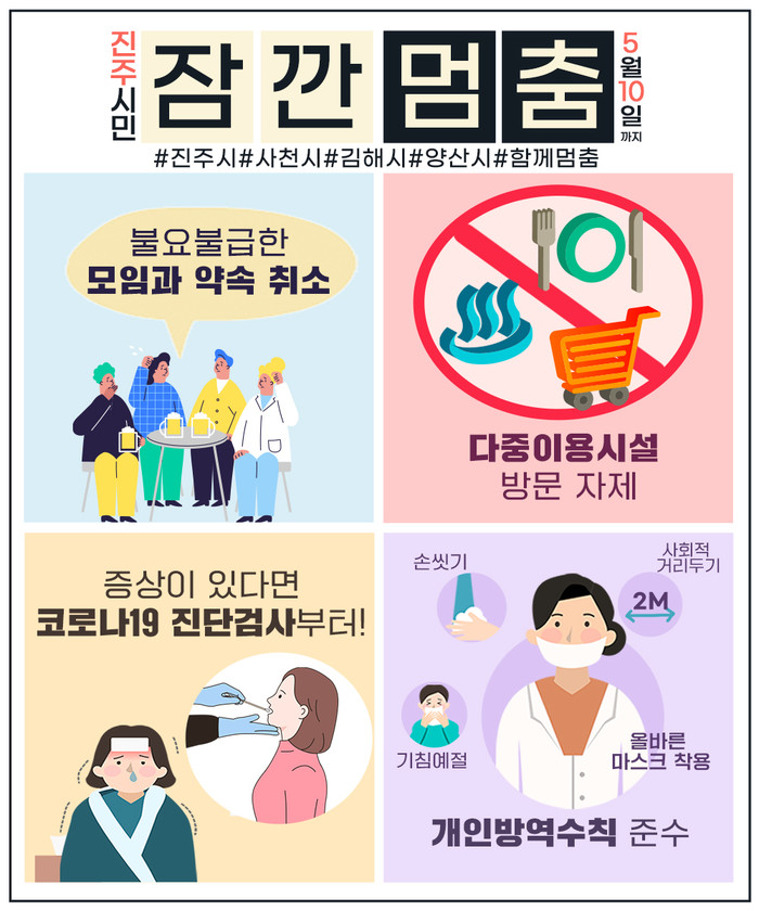 전국적으로 코로나19 감염 확산이 지속되는 가운데 지난 3일 경남도 주관으로 개최된 도내 4개 시(진주, 사천, 김해, 양산) 방역회의에서 진주시의 잠깐 멈춤 캠페인을 벤치마킹하기로 하고 지난 4일부터 4개 시에서 동시 시행하기로 했다.