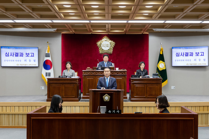 | 최동철 운영위원회 위원장이 심사 결과에 대해 보고하고 있다.(사진제공=강서구의회) |