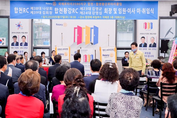 합천.합천황강로타리클럽 회장 합동 이.취임식이 지난 17일 합천애로컬푸드 직매장 3층 대회의실에서 문준희 군수, 석만진 군의회의장, 김윤철 경남도의원, 국제로타리클럽 3590지구 안재원 총재를 비롯한 관내 기관단체장과 클럽 회원 등 180여명이 참석한 가운데 개최됐다.