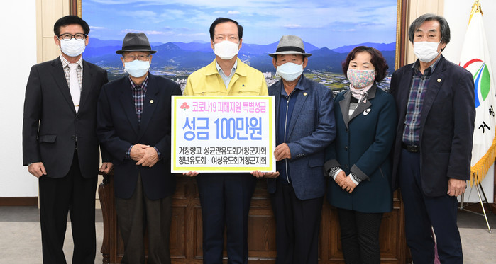 거창향교(전교 김삼수), 성균관유도회 거창군지회(회장 박정제), 성균관 청년유도회(회장 신춘성) 및 성균관여성유도회(회장 장미정)는 14일 군청을 방문해 성금 100만원을 기탁했다. 전통문화 계승과 예절교육 등 다양한 활동을 펼치고 있는 거창향교와 성균관 유도회 회원들은 코로나 극복을 위해 뜻을 모았다.