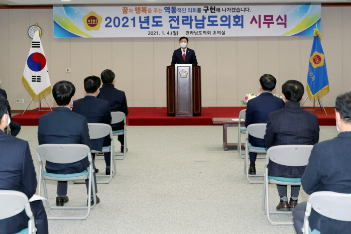 전라남도의회(의장 김한종)는 4일 도의회 초의실에서 2021년 시무식을 갖고, 2020년 의정활동 성과를 공유하고 올 한해 도민들을 위한 의회운영을 다짐했다.