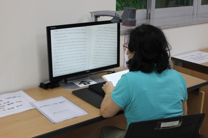 | ▲ 주민이 독서확대기를 사용 하고 있다. |