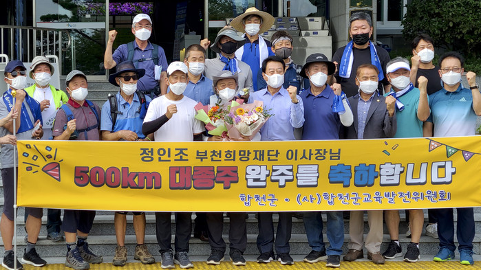 1km를 걸을 때 마다 100만원을 기부하는 고향사랑 평화기원 걸어서 고향까지 500km레이스를 시작한 정인조 이사장이 지난 달 19일(목) 오전 임진각 평화누리 공원 망향의 노래비 앞에서 고향 합천을 향해 첫 걸음을 내딘지 18일만인 9월5일 고향 합천에서 대여정을 마무리 했다.