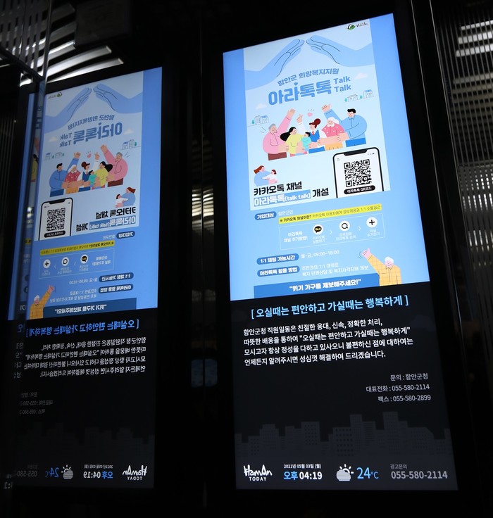 함안군은 주민의 알권리 충족과 군정전반에 대한 홍보효과를 높이기 위해 주민이동이 많은 아파트 승강기 안에 군정홍보용 LED 모니터를 설치했다고 4일 밝혔다.