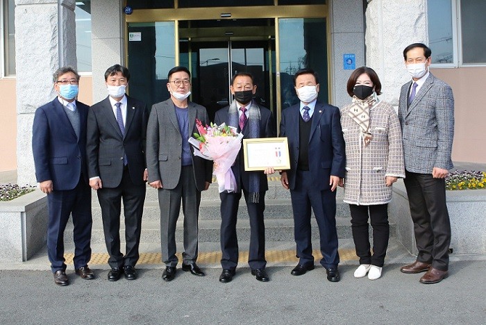| ▲ 강찬원 영암군의회의장(가운데)이 지난 21일, 전국시군자치구의회 의장협의회에서 주관하는 코로나19 K방역 유공의원으로 선정돼 의정봉사상을 수상해 이를 축하하는 동료 군의원 및 문길만 영암군의회 사무과장(오른 쪽) 등과 함께 영암군의회 입구에서 축하 기념촬영을 하고 있다. / 영암군의회 제공 |