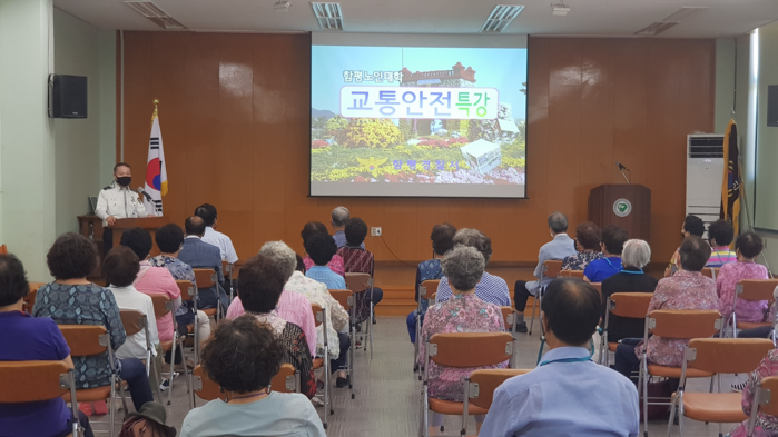 함평경찰서는, 지난 20일, 대한노인회함평군지회 요청으로 금년도 제40기 노인대학을 방문, 회원 50명 대상으로 사회적교통약자 어르신 들의 “교통안전의식 재고” 위한 “교통안전역량 강화” 교육을 실시하고 지속적인 증가추세에 있는 이륜차 및 사발이 등 교통사망사고 예방에 특히 주의를 기울이도록 당부하는 시간을 가졌다.