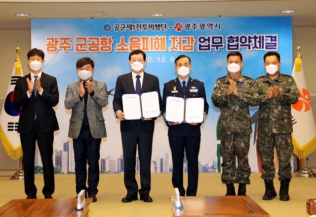 광주시는 8일 시청 비즈니스룸에서 이용섭 시장과 권오석 공군제1전투비행단장이 참석한 가운데 ‘광주 군공항 소음 피해 저감을 위한 업무협약’을 체결했다.