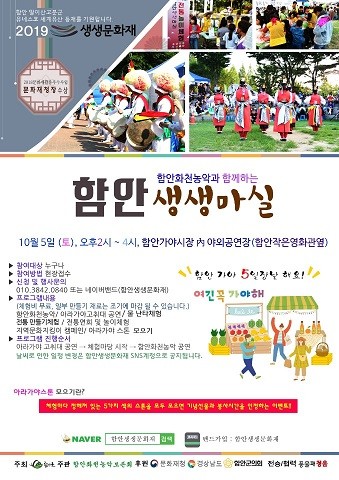 함안의 대표적 전통문화축제인 ‘2019년 함안생생문화재-함안화천농악과 함께하는 함안생생마실’의 올해 마지막 행사가 오는 10월 5일오후 2시, 함안 가야시장 내 야외 공연장(함안 작은영화관 옆)에서 열린다.