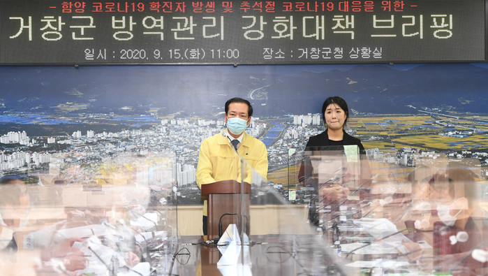 구인모 거창군수는 브리핑을 통해 “기나긴 장마와 집중호우, 태풍 등으로 어려움을 겪고 있으며, 코로나19로 인해 9개월이란 긴 싸움 속에서 마스크 착용의 피로감과 2단계 사회적 거리두기 등 매우 힘든 생활을 하고 있다”며 군민들을 위로하고, “최근 우리군과 연접한 지역에 확진자가 발생함에 따라 관내 확산방지를 위해 한층 강화된 방역관리 대책을 발표한다”고 밝혔다.
