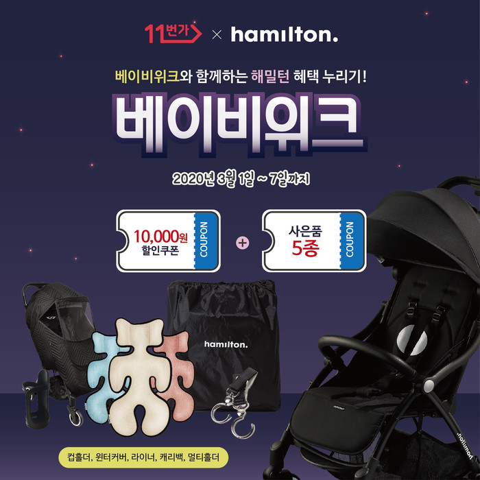 해밀턴유모차는 이번 이벤트를 통해 2020 X1 유모차 할인 판매와 더불어 구매 고객 모두에게 정품 악세사리 5종(컵홀더, 윈터커버, 라이너, 캐리백, 멀티홀더)을 사은품으로 증정한다. 또한 11번가 이벤트 페이지를 통해 1만원 할인 쿠폰도 지급한다.