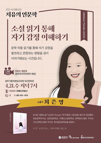 치유의 인문학은 코로나19 사회적거리두기에 따라 인원을 제한하며, 유튜브 채널 ‘광주트라우마센터’로도 생중계될 예정이다. 강연 내용은 광주트라우마센터 홈페이지의 ‘활동과 소식’에서 확인할 수 있다.