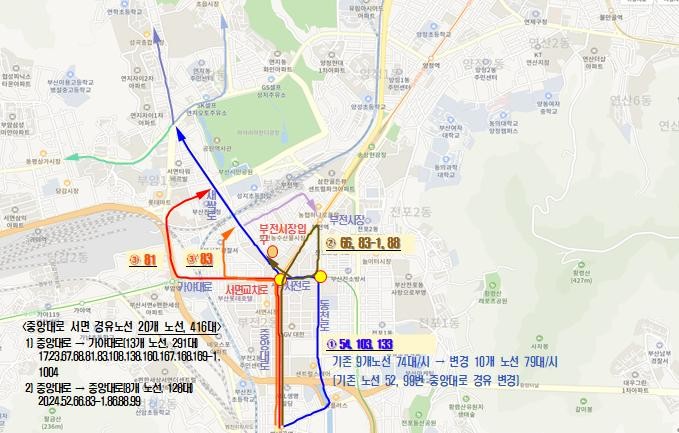 조정되는 8개 노선 중 81번 83번 2개 노선은 서면한전에서 가야대로로 좌회전해 83번은 부산진경찰서를 통해 부전시장을 돌아 회차하고 81번은 부암교차로를 통과, 부산진구청에서 초읍방면으로 조정된다.