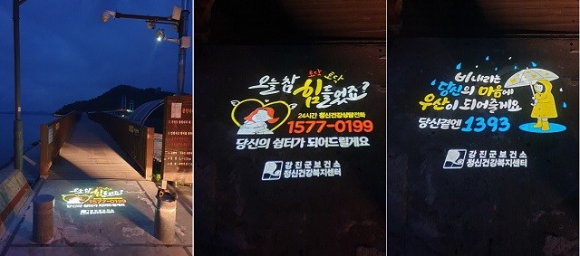강진군보건소는 지난 5월 가우도 출렁다리 입구와 고성사 산책로에 2대의 로고젝터를 설치해 24시간 자살예방 상담전화와 강진군 정신건강복지센터를 홍보해 마음이 힘든 이웃을 보다 적극적으로 발굴하는 역할을 해내고 있다.