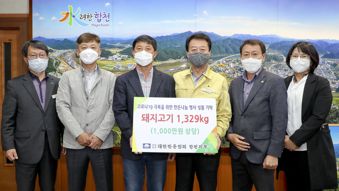 대한한돈협회합천지부(지부장 백성환)은 지난 17일 합천군청을 방문하여 코로나 19로 어려움을 겪고 있는 이웃에 전달해달라며 돼지고기 1,329kg(1,000만원 상당)을 기탁했다.
