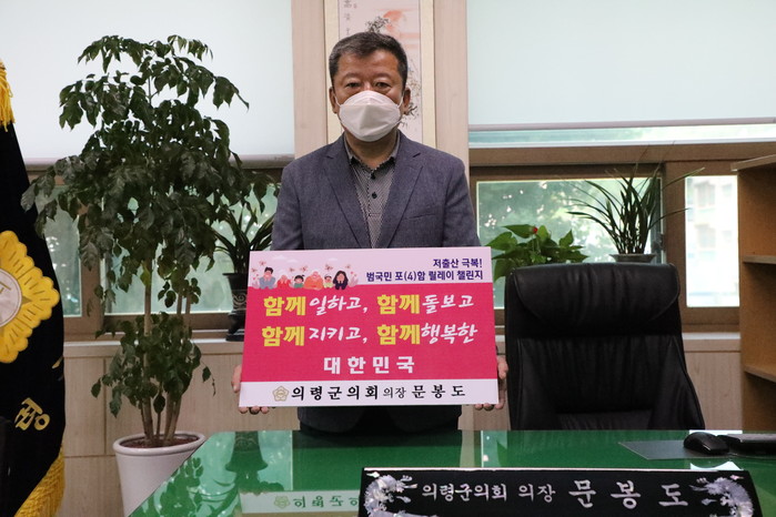 ‘낮은 자세로 군민의 뜻을 대변하는’ 의령군의회 문봉도 의장은 인구감소에 대한 심각성을 알리고 인구절벽에 대한 인식개선을 위해 지난 14일 ‘저출산 극복 범국민 릴레이 챌린지’에 동참했다.