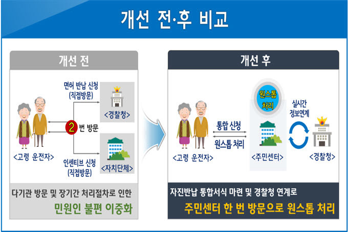 그동안 운전면허를 자진반납 후 인센티브 지원신청(선불교통카드 10만 원)을 하기 위해 운전자들이 직접 경찰청과 동주민센터를 이중 방문해야 했지만 이러한 불편을 해소하기 위하여 행정안전부가 면허 반납과 지원신청을 동주민센터에서 한 번에 처리할 수 있는 고령운전자 운전면허 자진반납 간소화 서비스를 구축, 8월부터 전국적으로 시행하기로 했다.