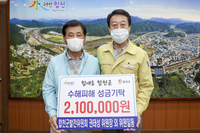 합천군 발전위원회(위원장 권태성)는 지난 8일 수해 피해로 힘든 시기를 겪고 있는 수해민을 위해 써달라며 합천군(군수 문준희)에 수해복구 성금 2백십만원을 기탁했다.