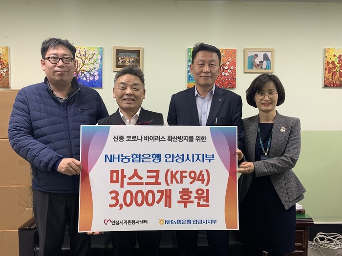 NH농협은행 안성시지부 김상수 지부장은 “신종 코로나 바이러스 확산으로 인한 국가적 위기 상황에서 안성시민의 안전과 건강을 돕는 일에 동참하고 싶었다”면서 “이번에 후원한 마스크가 지역사회 바이러스 확산 방지에 소중하게 사용되어 위기를 잘 극복하기를 바란다”고 말했다.