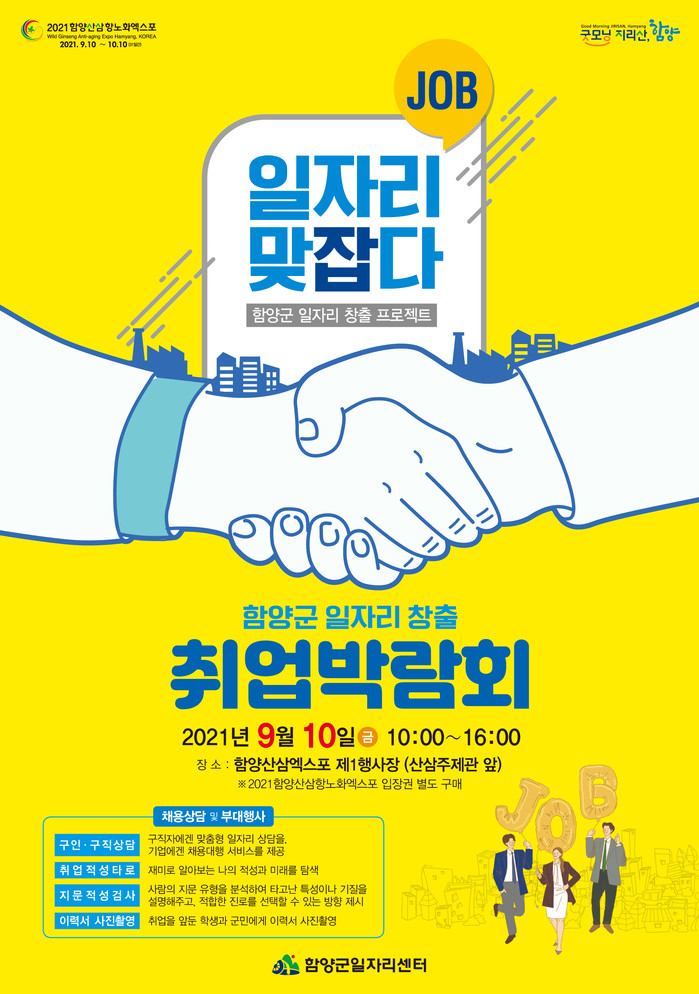 함양군은 코로나19로 어려움을 겪고 있는 지역민들에게 폭넓은 취업기회를 제공하고 기업에게는 우수 인재 채용기회를 확대하기 위한 ‘2021년 함양군 일자리 맞JOB다’취업박람회를 9월 10일 개최한다.
