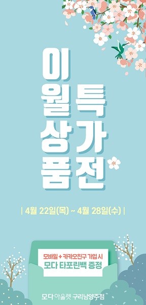 이 외에도 모다 모바일 회원과 카카오 플러스친구 동시 가입 시 타포린백을 증정하는 프로모션도 4월 28일까지 진행한다. 해당 사은품은 3층 고객센터에서 수령할 수 있다.