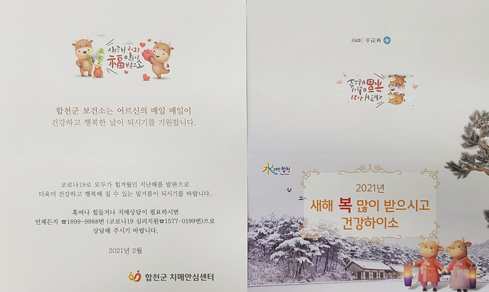사회적 거리두기로 북적한 명절 대신 조용한 설을 보내야 하는 어르신의 적적한 마음을 달래고자 치매안심센터에 등록된 치매 어르신 1,500여 명에게도 설명절 연하장이 발송됐다. 치매안심센터 계장은 “코로나19의 장기화로 발생할 수 있는 치매어르신의 고립감을 최소화하고 치매 증상 악화 방지 및 심리적 안정을 위해 지속적인 노력을 통해 치매관리에 공백이 생기지 않도록 하겠다”라고 전했다.