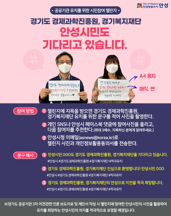 [안성=오왕석 기자] 안성시는 지난달 17일부터 김보라 안성시장을 시작으로 경기도 공공기관 안성 유치를 위한 시민참여 챌린지를 진행하고 있다.