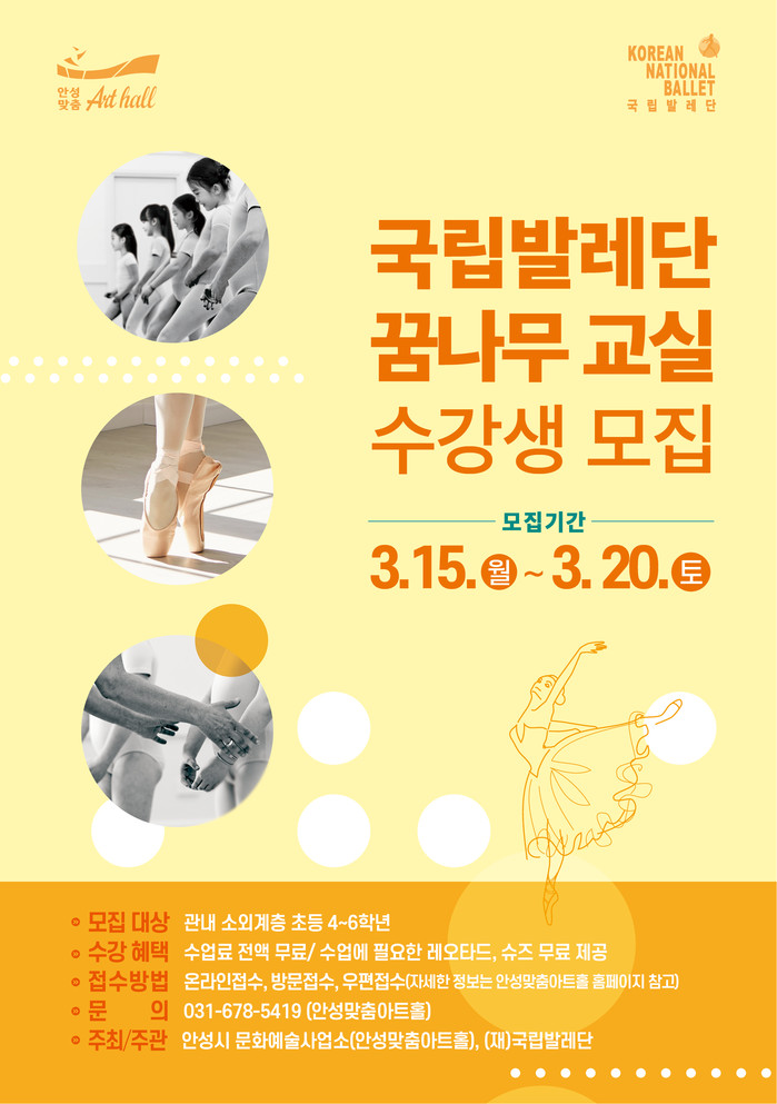 한편, 국립발레단의 공익사업인 ‘국립발레단 꿈나무 교실’은 지역의 기관과 협력하여 지역의 소외계층 청소년을 대상으로 발레단의 수준 높은 교육 및 공연 프로그램이 제공되는 사업으로, 경기도에서는 안성만 유일하게 진행된다.