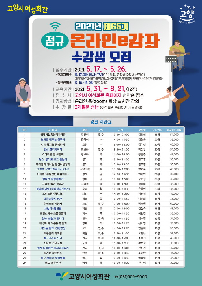 [고양=이기홍 기자] 고양시 여성회관은 오는 5월 31일부터 3개월 과정의 온라인e강좌를 운영, 이달 17일부터 수강생 약 500명을 모집한다.