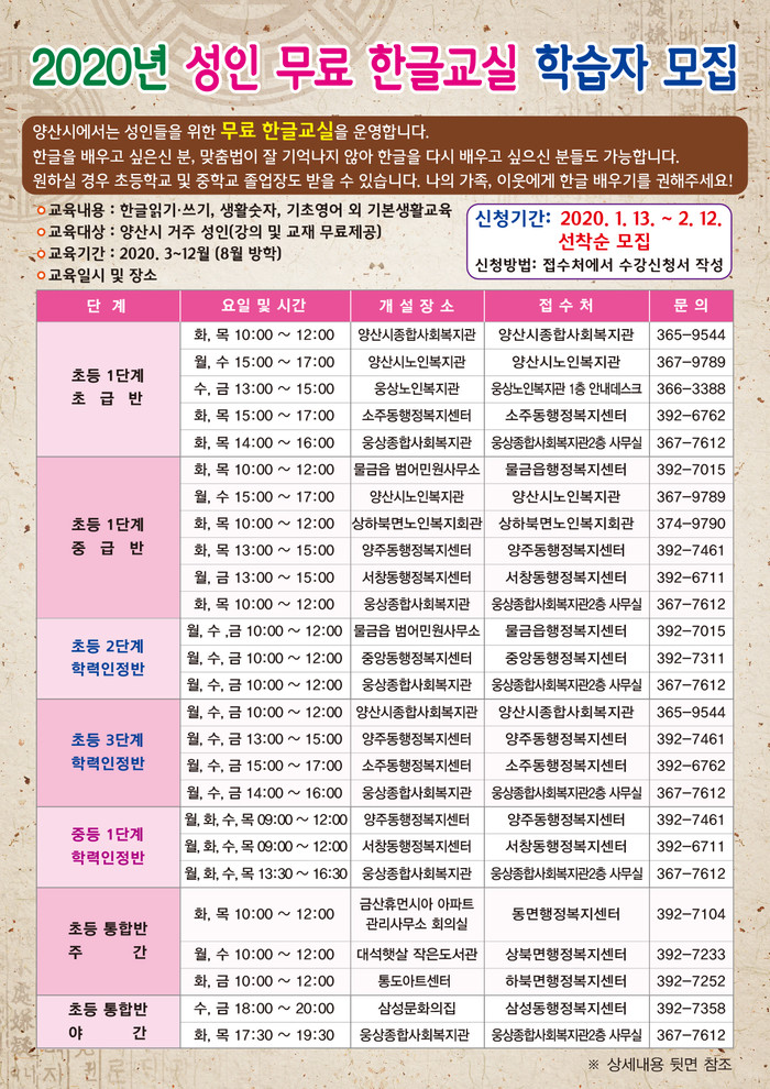 양산시는 학령기 동안 사회적, 경제적 어려움으로 인해 기초교육을 받을 기회를 놓친 성인을 위한 무료 한글교실 학습자를 오는 13일부터 2월 12일까지 읍면동행정복지센터 및 관내 복지관에서 모집한다.