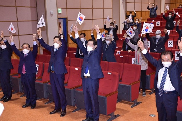 [광주=정찬남 기자] 이용섭 광주광역시장(사진, 앞줄 가운데)이 9일 오전 서구 광주학생독립운동기념회관 강당에서 열린 '제102주년 대한민국 임시정부정수립 기념식'에 참석해 김용집 시의회 의장, 장휘국 광주시교육감, 김주원 광복회광주시지부장, 광복회원 등 참석자들과 만세삼창을 외치고 있다.