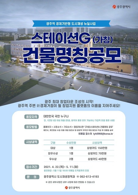 임찬혁 시 도시재생정책과장은 “(가칭)스테이션 G 건립사업은 청년창업 지원과 더불어 인공지능 및 지식서비스산업 중심의 지속가능한 일자리를 창출하는 도심형 산업생태계 조성의 핵심적인 시설이 될 것이다”며 “호남권 최대 창업타운 조성의 시작점이 될 ‘(가칭)스테이션 G’ 건물 명칭공모에 많은 시민 분들의 관심과 참여를 부탁드린다.”고 말했다.