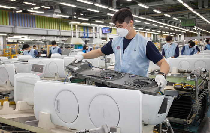 | ▲ 광주광역시 광산구 하남산단 6번로에 위치한 삼성전자 광주사업장에서 직원들이 ‘무풍에어컨’을 생산하고 있다.(사진제공=삼성전자) |