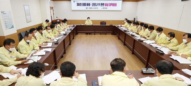 | ▲ 이승옥 강진군수가 26일 오전 실과소 관계자들이 참석한 가운데 제8호 태풍 '바비' 북상에 대비해 비상대책회의를 주재하고 있다. / 강진군 제공 |