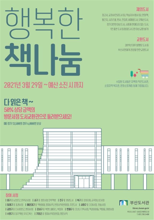 부산시(시장권한대행 이병진) 부산도서관은 오는 3월 29일부터 지역서점 활성활를 위한 ‘행복한 책나눔’ 사업을 추진한다고 밝혔다. 작년까지 시민도서관에서 추진해왔으나 올해부터 지역대표도서관인 부산도서관이 직접 참여서점을 공개 모집하여 25개소로 확대하여 추진한다.
