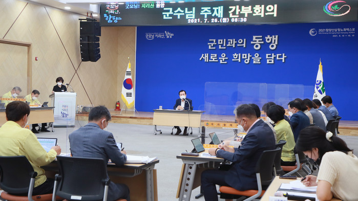 함양군은 7월 26일 오전 서춘수 군수 주재로 간부회의를 개최하고 각 부서별 추진할 중요 현안사업에 대해 보고하고 원활한 사업 추진을 위한 각 부서의 협조를 이끌어 냈다.