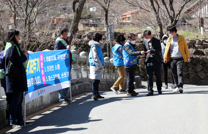 이 날 밀양시 공무원과 주민자치연합회, 자원봉사협의회 등 10개 사회봉사단체 회원들은 상춘객들이 많이 찾는 관내 주요 관광지와 커피숍, 상가, 전통시장 등을 방문하여 ‘사회적 거리두기’에 대한 홍보를 펼쳤다.