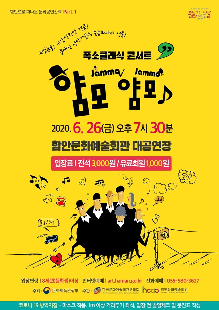 ‘얌모얌모 콘서트’는 한국문화예술회관연합회의 2020년 지역문화예술회관 문화가 있는 날 지원 사업으로 진행되며, 문화가 있는 날은 국민이 일상에서 문화를 쉽게 접할 수 있도록 매달 마지막 주 다양한 문화혜택을 제공하는 날이다.