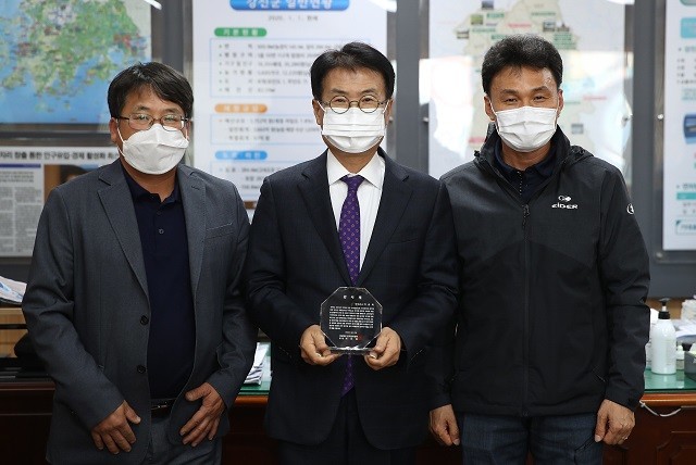 | ▲ 이승옥 강진군수(가운데)가 지난 23일 사단법인 한국절화협회(회장 서용일)로부터 감사패를 받았다. 이날 감사패는 그린화훼영농조합법인(대표 김양석)에서 대신 전달했다. / 강진군 제공 |