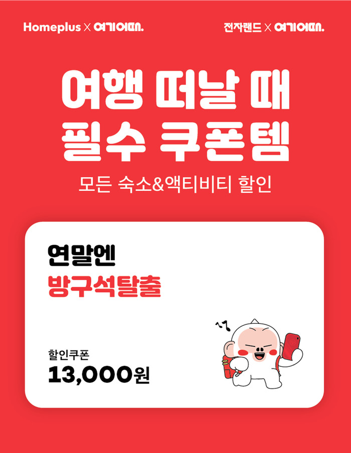 [시민일보 = 고수현 기자] 국내 대표 종합숙박·액티비티 예약서비스 여기어때(대표 최문석)가 홈플러스, 전자랜드와 손 잡고 연말연시 국내여행 활성화 캠페인에 나선다.