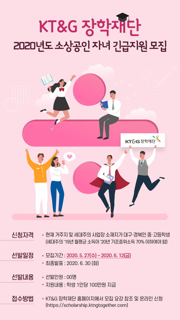 [시민일보 = 홍덕표 기자] KT&G장학재단이 코로나19의 영향으로 경제적 어려움을 겪는 영세사업자를 지원하기 위해 ‘2020년 소상공인 자녀 긴급지원 장학생’을 모집한다.