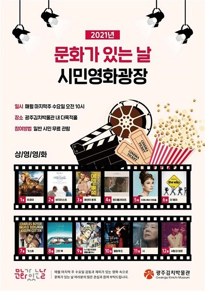 시민영화광장은 명작 영화를 엄선해 매월 마지막 수요일 오전 10시 광주김치타운 내 김치박물관 다목적홀에서 상영한다.
